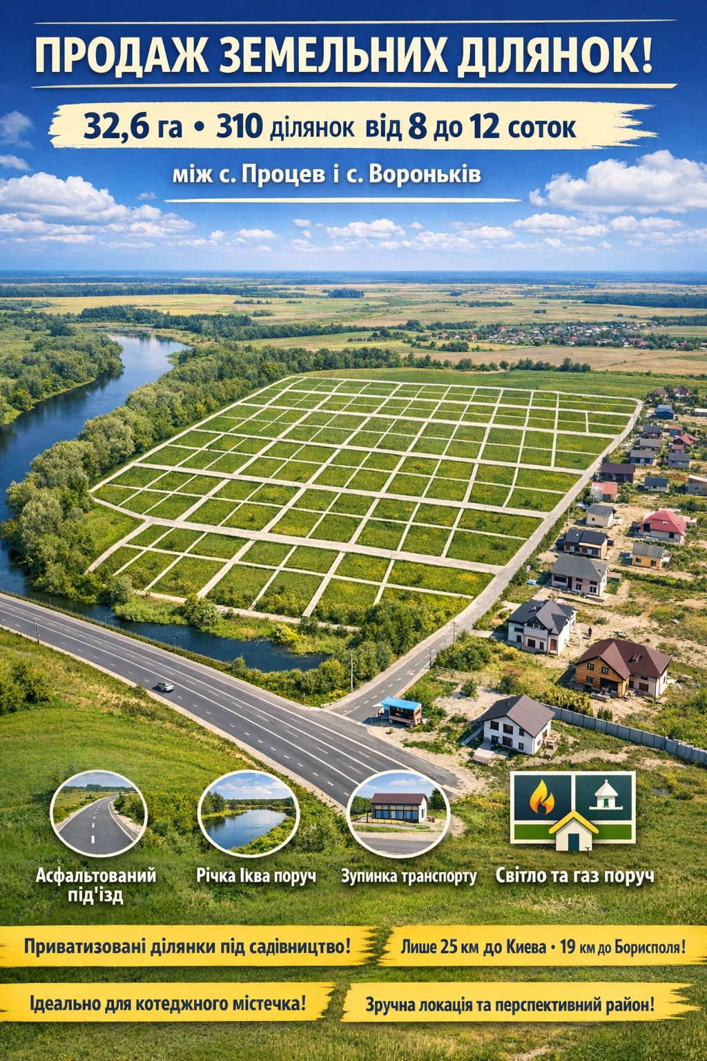Продаж земельної ділянки загальною площею 32, 6 га (масив розбитий на 310 окремих земельних ділянок від 8 до 12 соток). Ділянки знаходяться між с. Процев і с. Вороньків.