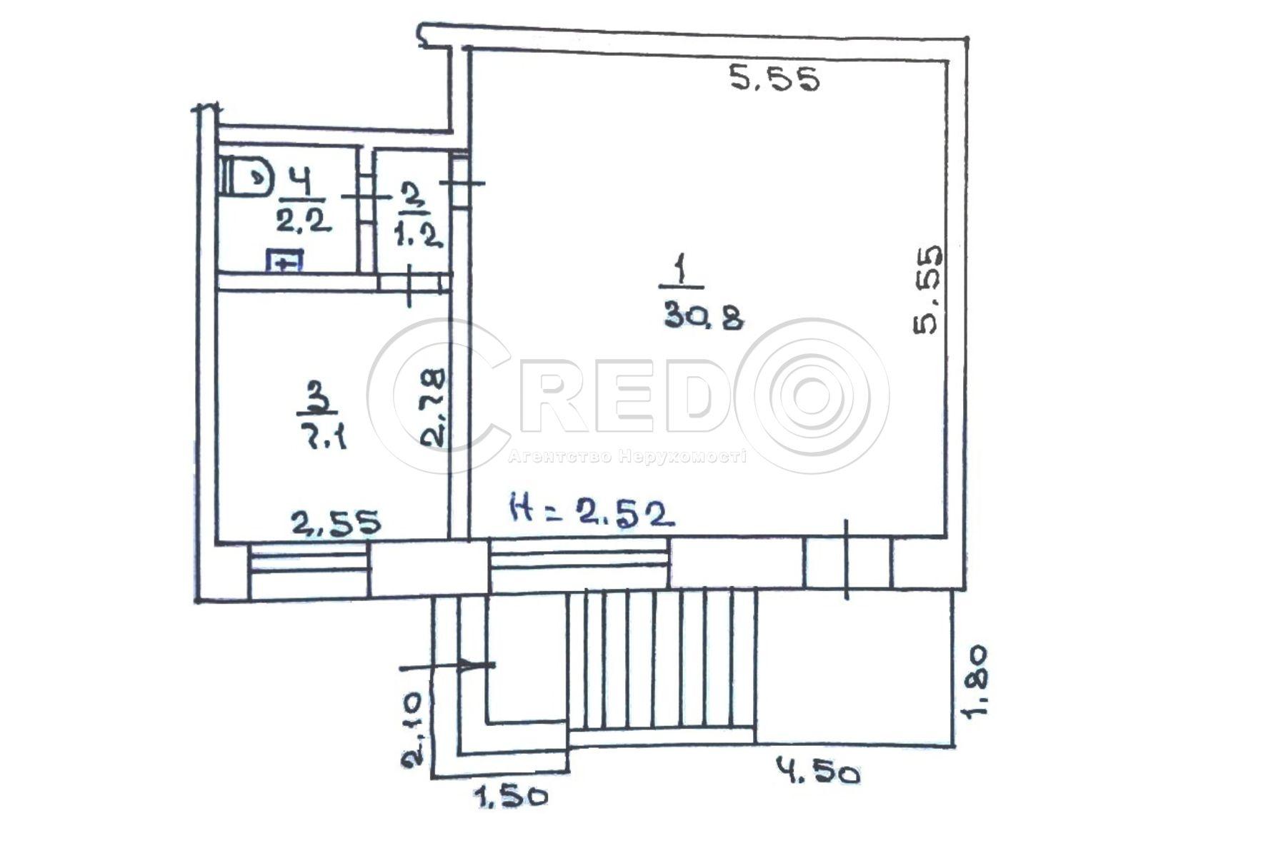 Планування об’єкту: - Розташоване на 1/5-ти поверхового будинку - Загальна площа – 41,3кв.м., - Торгівельна пл.- 30,8кв.м., - Висота стелі 2.52м - Сан.вузол - Підсобне приміщення.