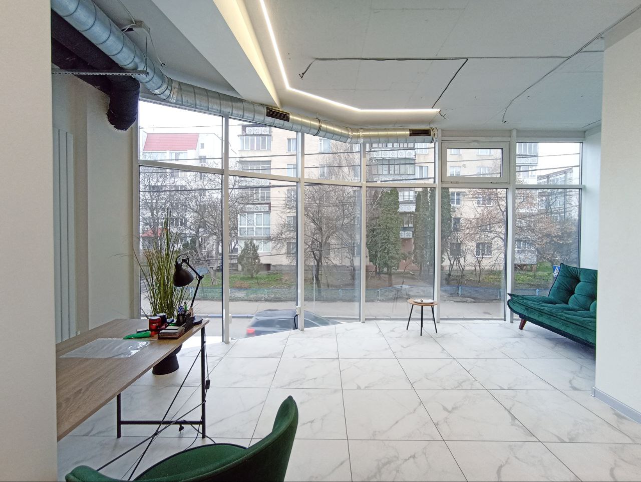 Бізнес центр новий та сучасний, повністю працюючий. Цілодобовий доступ. Світло 24/7. Панорамне фасадне вікно на всю ширину.