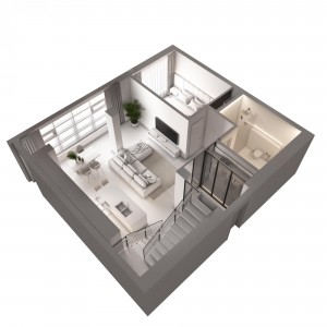 1-й рівень (19-й поверх): кухня-студія – 20,85 кв.м, спальня 22,48 кв.м, санвузол 6,56 кв.м, передпокій – 16,66 кв.м, лоджія – 6 , 73 кв.м.