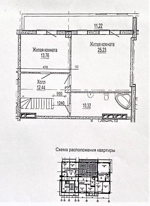 2-й рівень (20-й поверх): дві спальні – 13,76 кв.м та 25,23 кв.м, санвузол 10,32 кв.м, хол – 12,44 кв.м, тераса – 11,22 кв.м.