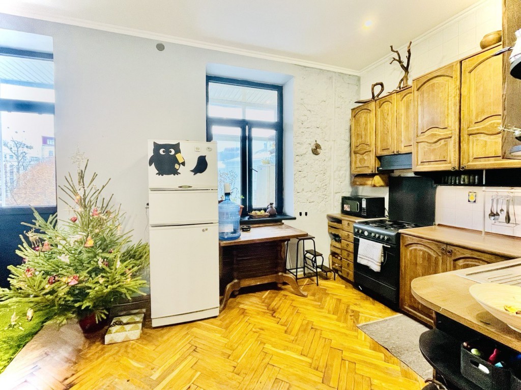 * Итак 4 комнаты, уютная кухня-столовая, лаконичный санузел, разделённые длинным коридором, паркетные полы все с «жилым» ремонтом, тут возможно сделать перепланировку, есть два балкона с прекрасными пейзажами древнего Киева.