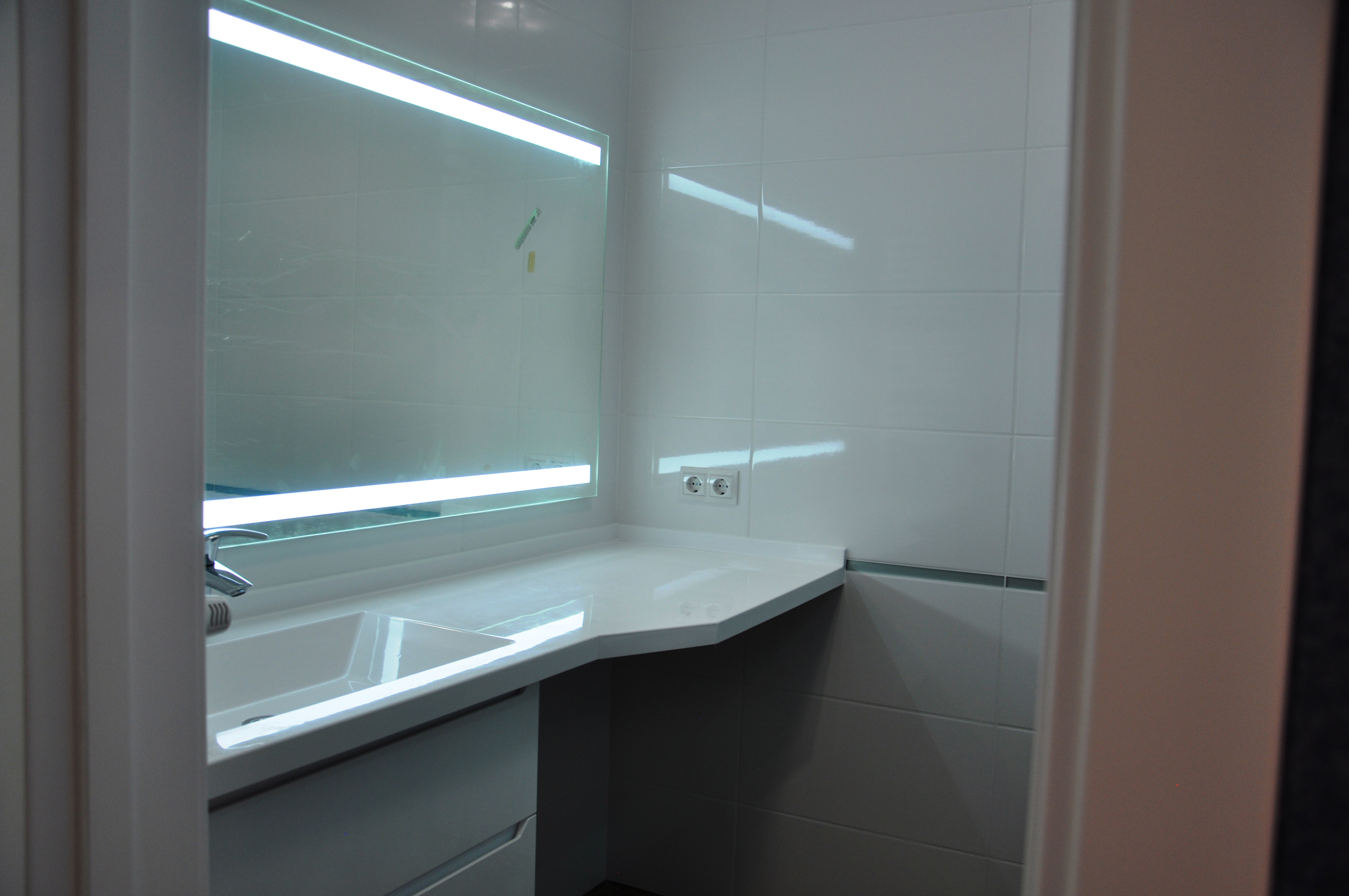 • Дзеркало, як і умивальник довжиною у всю стіну, доповнене підсвіткою