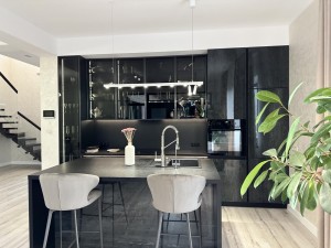 Перший поверх: вхідна група, спортивна зала, кабінет або дитяча, кухня вітальня на 49 кв.м. обладнана зоною відпочину, обійденим столом та робочим острівцем в кухонній зоні, санвузол першого поверху.